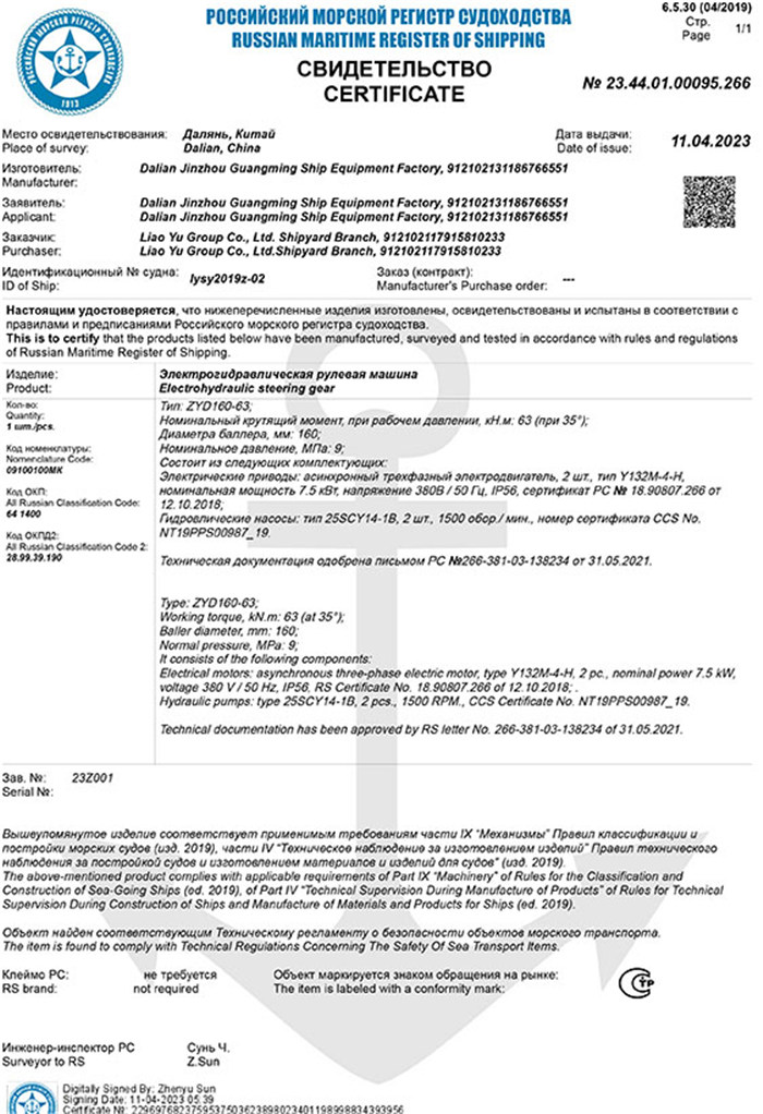RS船用產(chǎn)品證書(吊機(jī))